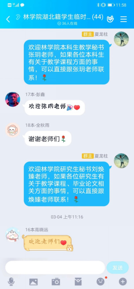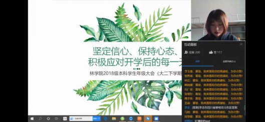 疫情期间依靠各位老师和学生干部的积极配合,学院日常的学生工作进展也十分顺利。针对疫情期间的学生工作,从学生干部到各班的班长支书再到班级每位学生,都为抗击疫情做出了力所能及的贡献: 2017级本科生辅导员夏龙柱老师带领williamhill英国团委积极配合校党委和团委的工作部署;学生干部积极参加团支部的线上团日活动,充分利用新媒体平台进行交流沟通;班长支书作为班级与学院沟通的媒介,为同学们转发各类通知、文件,班级日常管理稳定有序;同学们积极配合学院工作,坚持每日如实汇报身体状况,坚持每日线上学习。夏龙柱老师也在网络会议上对同学们寄语了嘱托与期盼:疫情就是命令,防控就是责任!林院学子,等春来,和兴路26号的主楼依旧雄伟,静候诸君平安归来!