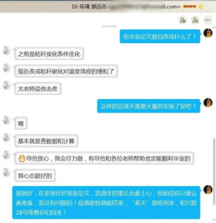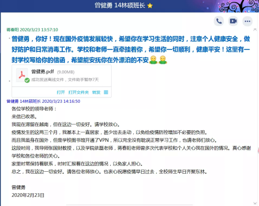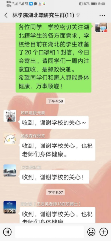 研究生专职辅导员蒋春阳老师通过年级群、班长群、班级群、党支部群、学科群、导师群,线上党支部大会、班会等媒介,发布各类预防疫病的信息和学校有关管理规定信息。同时关注经济困难学生的需求,学生的心理动态,并及时给予关心和帮助,帮助毕业生做好毕业协调事宜。