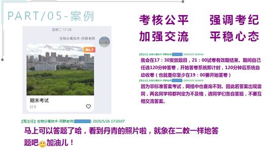 王超教授的《林木育种学》是2019年经学校已验收的校级精品在线课程,她和另外两位教授通过不断“加码”成功把这门课程变成“hard”模式,为学生编织了一张密密麻麻的“教学考核网”。在教学中他们采用“翻转课堂”确保线上教学效果,在考核方式上则设计出了一套堪称完美的考试方案:征求意见定方式、考前培训加演练、非标准化开放题、PDF考卷并加密、考卷密码分开给、作答过程约三点——“不可打字、不可拍照、不可语音”、全程滚动录截屏、钉钉家校本交考卷、扫描软件保清晰等一系列举措。