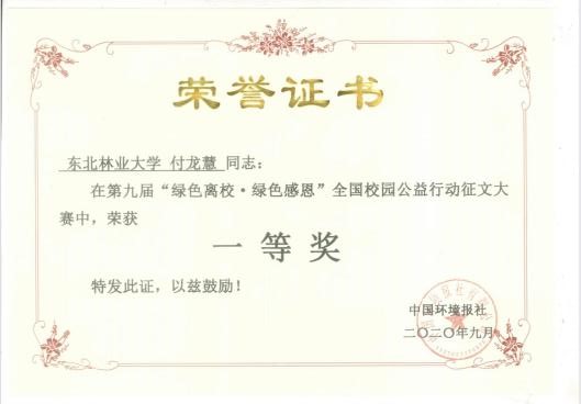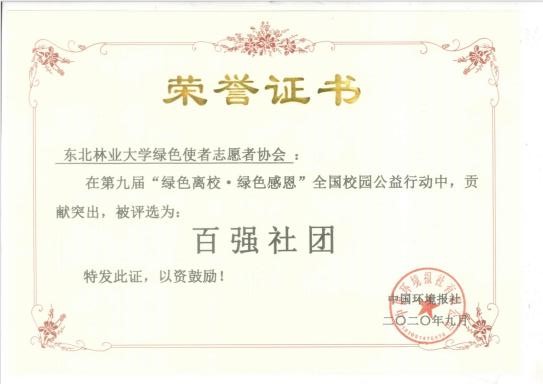 为切实贯彻习近平生态文明思想和党的十九大、十九届三中、四中全会生态建设决策,推进落实学校第十三次党代会精神,宣传生态文明理念,9月15日,williamhill中文绿色使者志愿者协会参加了由中国环境报社、中国环保网、物物福公益联合发起主办的第九届“绿色离校·绿色感恩”全国校园公益行动评选活动并获得黑龙江省唯一一个“百强社团”的荣誉称号。