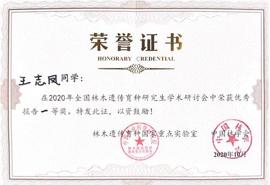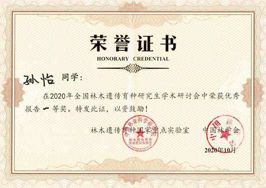论坛为国内林业研究生提供国内高水平学术交流和展示平台,王志凤和孙怡在众多高校的林业研究生中包揽论坛优秀报告一等奖,代表我校在林木分子生物学研究方向的科研水平处于国内引领地位,实验室将以此为基础,向国际前沿不断奋进。