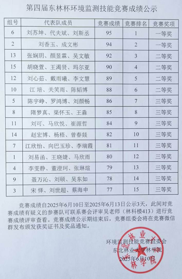 经竞赛组委会认真评审,刘苏坤等5名同学获得一等奖,张娴玥等12名同学获得了二等奖,刘颜畅等27名同学获得了三等奖。于2025年6月16日举行了竞赛颁奖仪式,在学院领导的大力支持及竞赛组委会的精心筹备组织下,本次环境监测技能竞赛圆满落下帷幕。