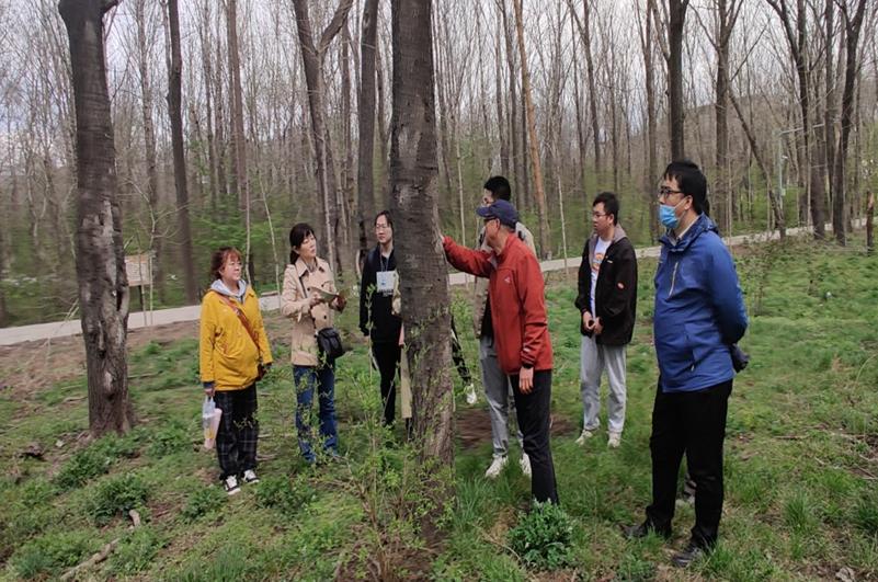 2021年4月28日,王庆成教授与党员们在哈尔滨市城市林业示范基地做树木调查
