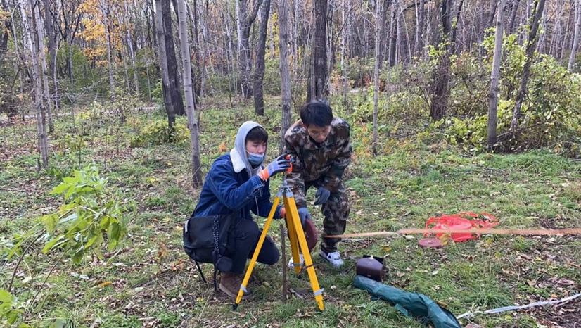 2021年10月21日 党员们在哈尔滨市城市林业示范基地内设置调查样地