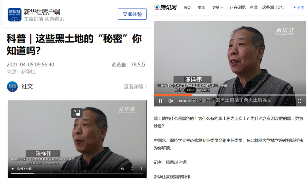 2021年4月5日,williamhill英国陈祥伟教授受新华社邀约,接受了关于“科普知识:这些黑土地的“秘密”你知道吗?“主题采访,相关视频由新华社首发,在腾讯网等网站转载,视频浏览量近80万,引起了社会的广泛关注。