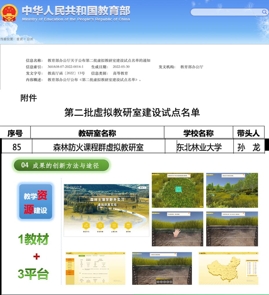 “森林防火课程群虚拟教研室”获批教育部第二批虚拟教研室建设试点;张韫《森林土壤学野外实习虚拟仿真实验》获批省级虚拟仿真实验教学项目立项。项目研究直击新时代背景下林学专业传统实践教学体系与先进教学理念矛盾、经典教学内容与国际学术主流接轨、专业课程教学与思政全面育人协同进等传统教学痛点与难点问题。